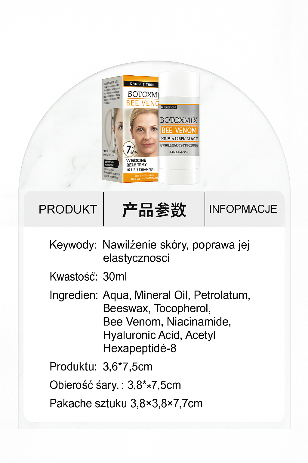 Możesz być spokojny – Flysmus™ Botox Bee Venom Firming Serum Stick jest wykonany w 100% z naturalnych składników, co gwarantuje zarówno bezpieczeństwo skóry, jak i wysoką jakość produktu.