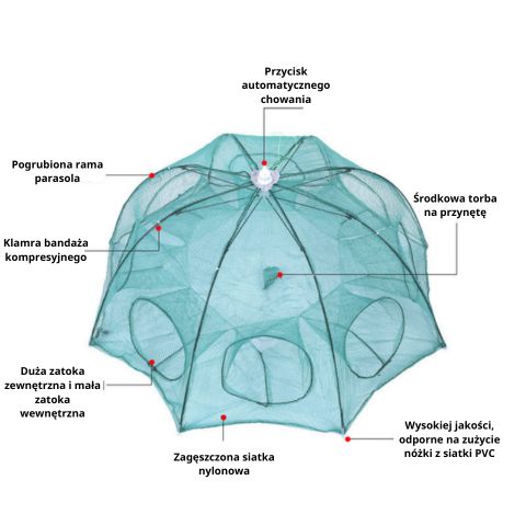 - Wysoki wskaźnik sukcesu: duże zewnętrzne wejście i mała wewnętrzna konstrukcja pułapki zapewniają, że ryba nie może uciec.