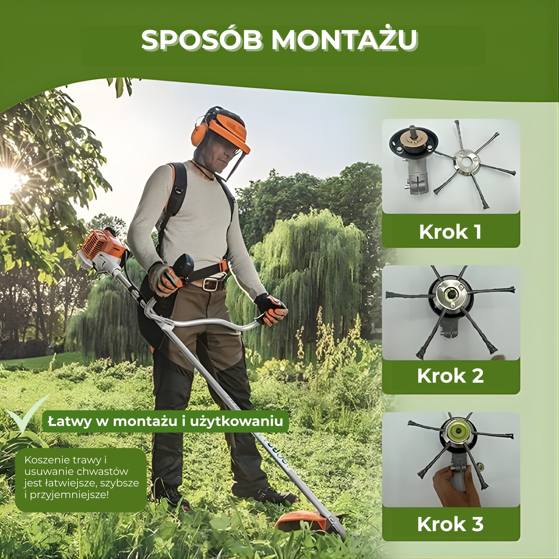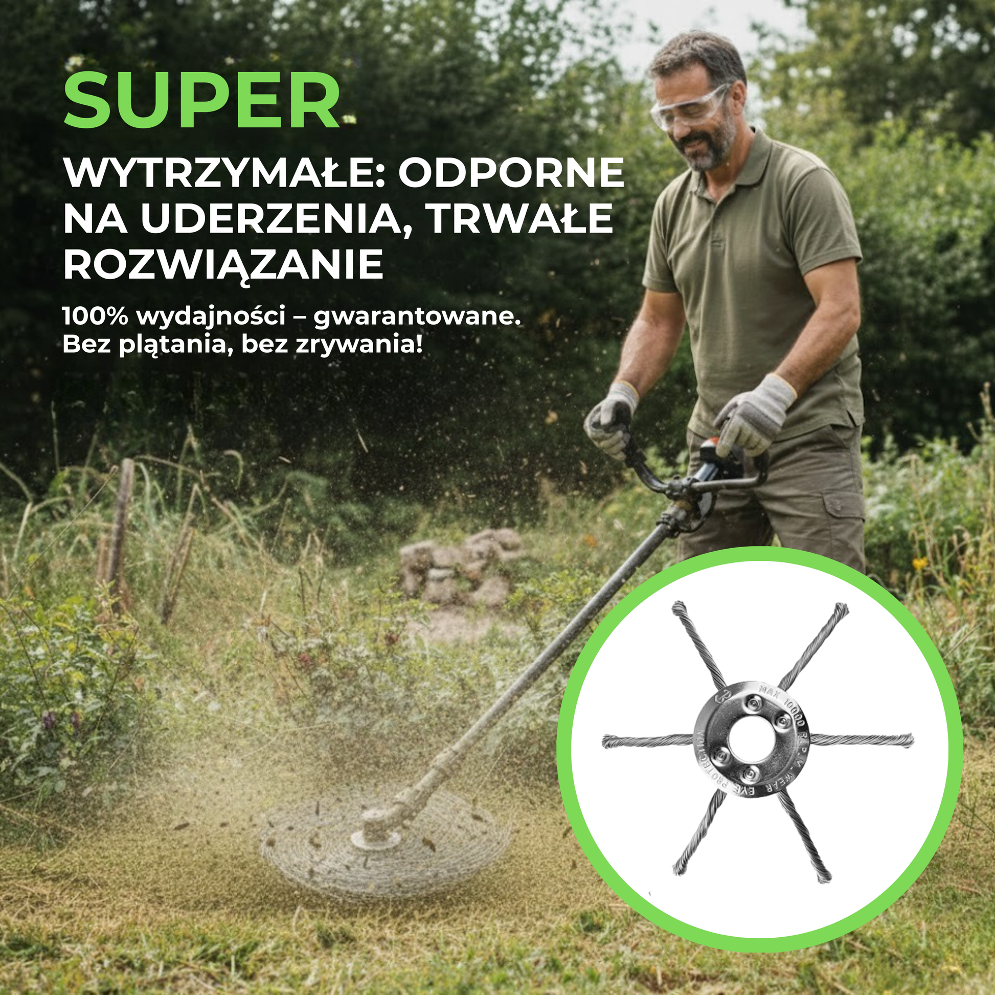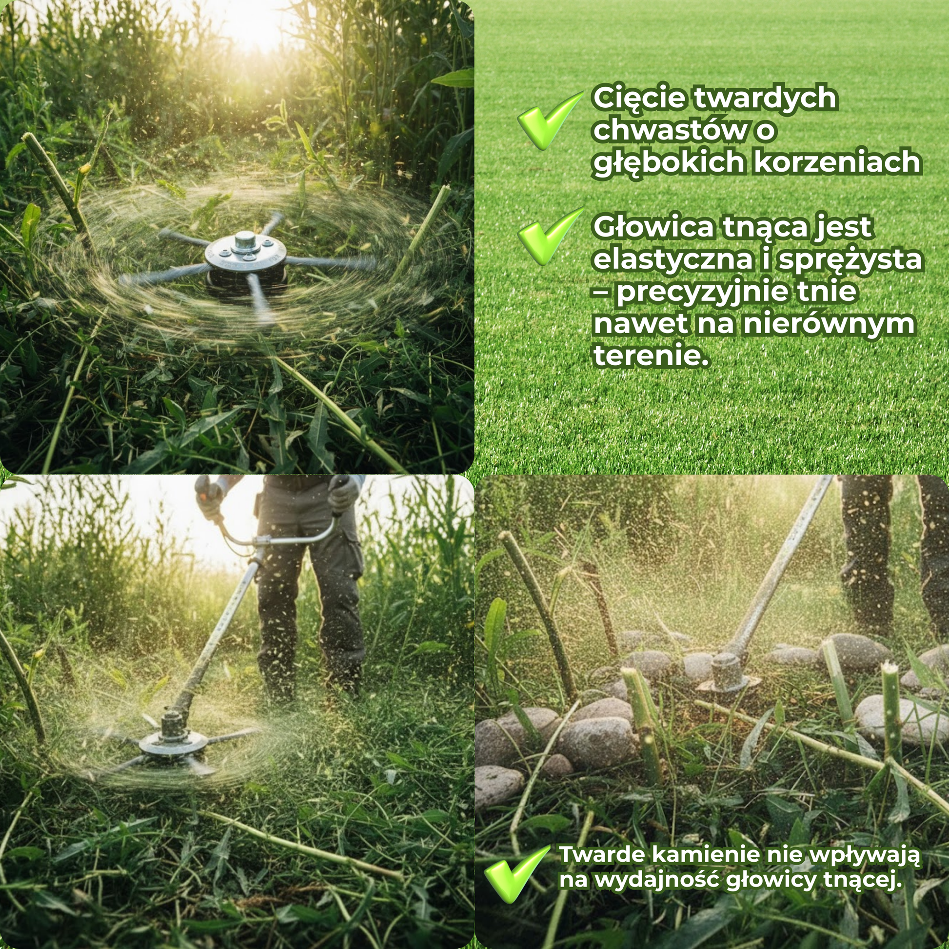 Głowica kosiarki posiada 6 splecionych ramion wykonanych z wytrzymałego drutu stalowego.